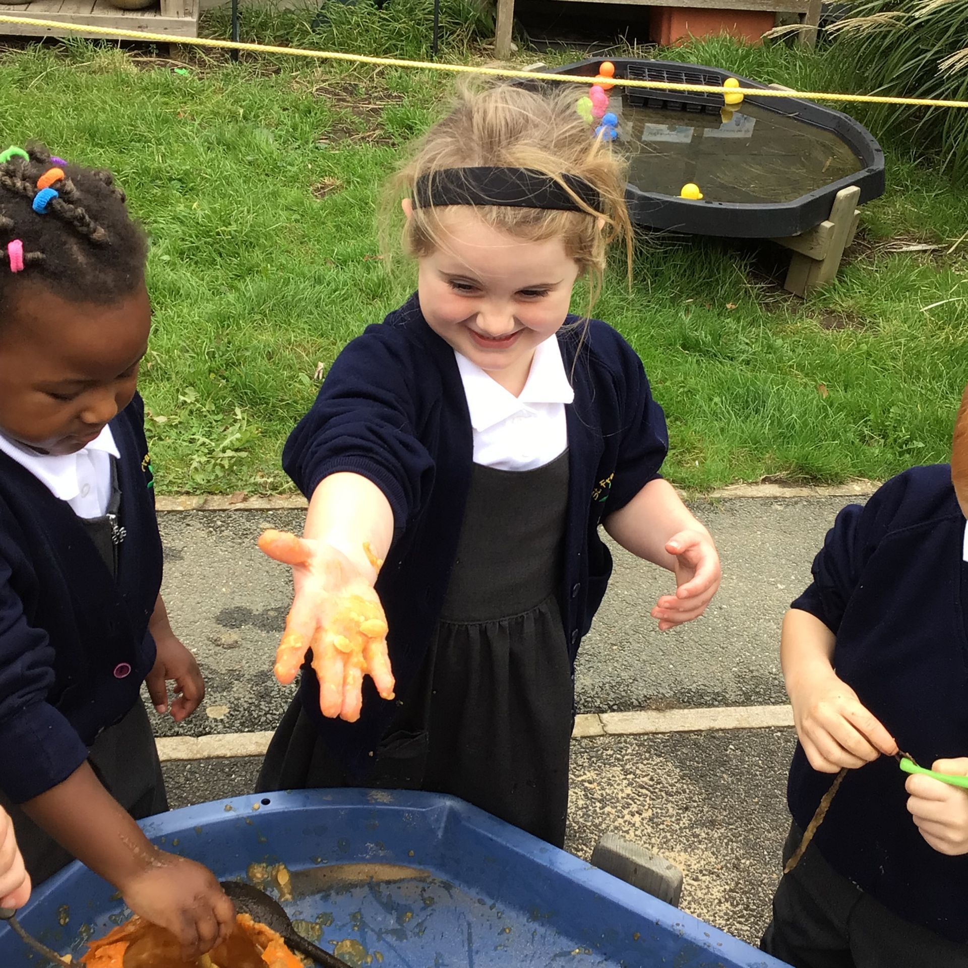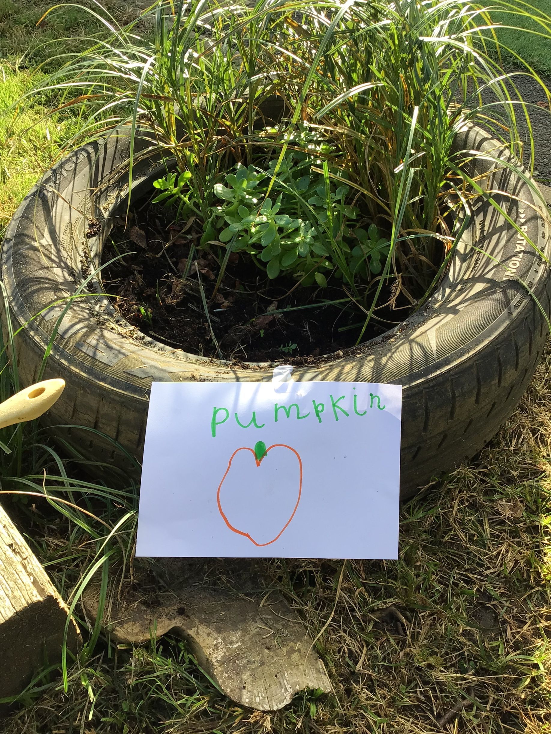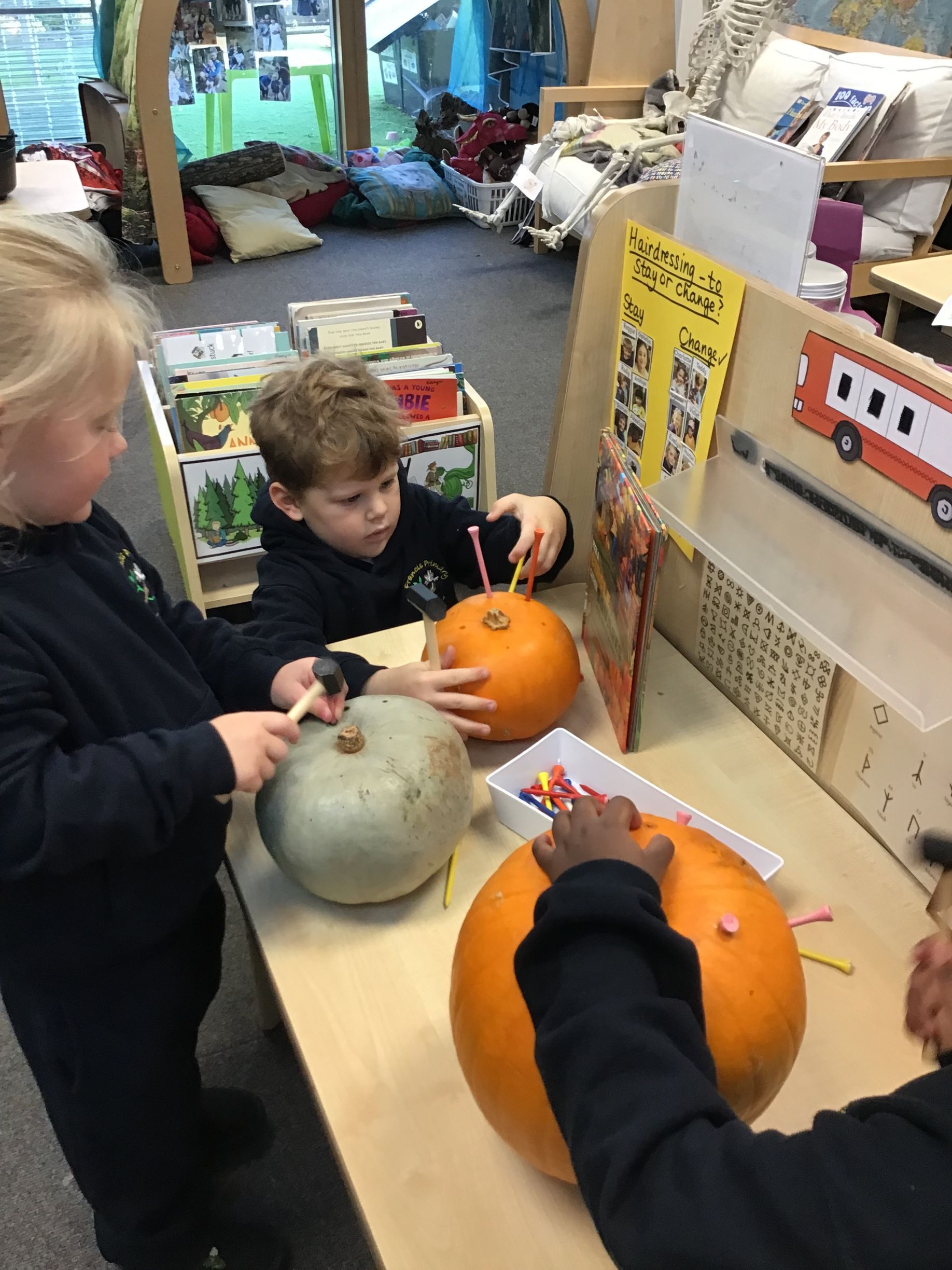 The class have enjoyed hammering pegs into pumpkins to help build up our finger muscle strength. After a pumpkin collapsed with all the hammering, we took it outside to scoop out the seeds and pulp. Charlotte enjoyed cleaning the seeds and replanted them in our outside area. She made a sign to show where they had been buried.