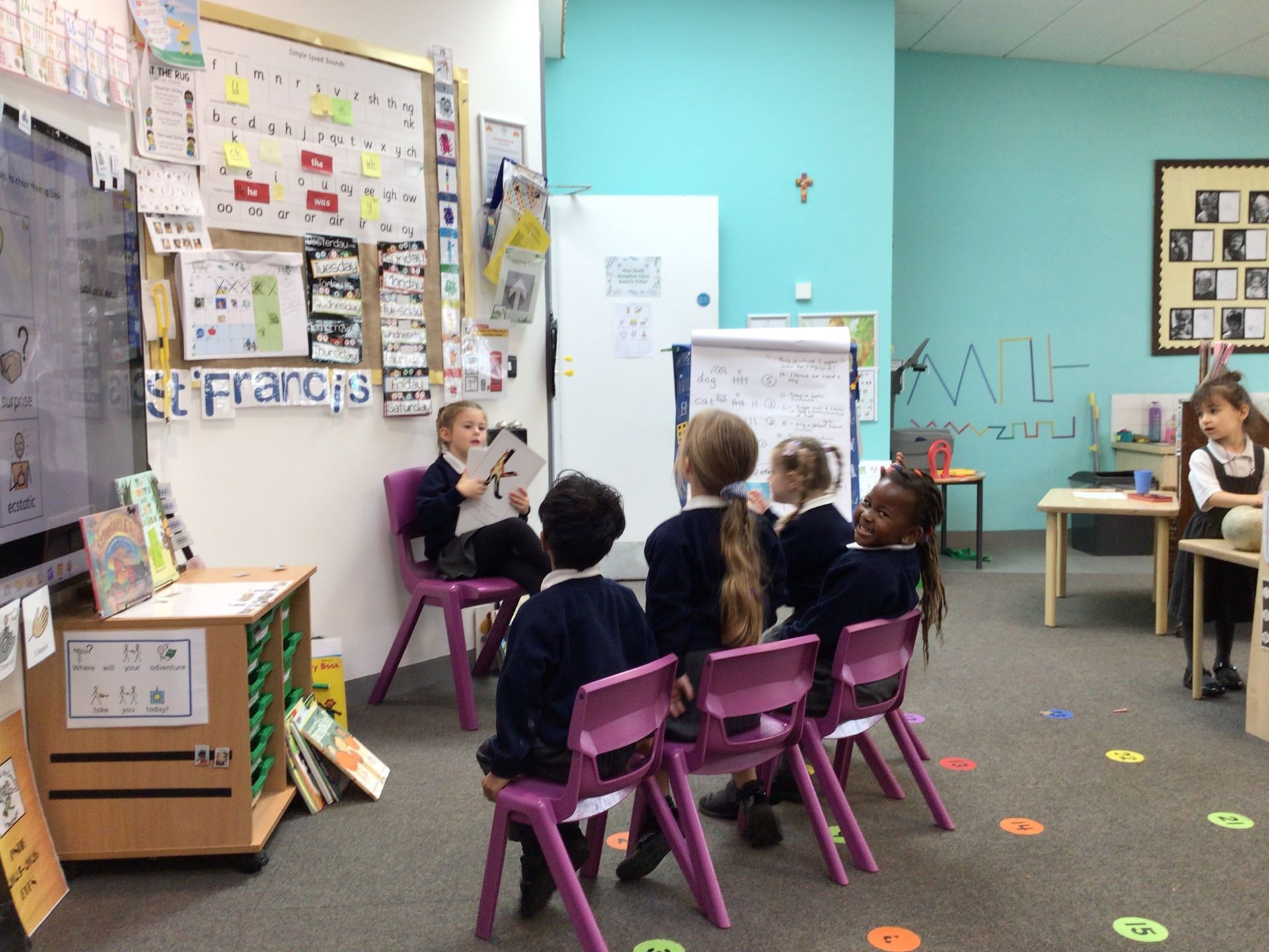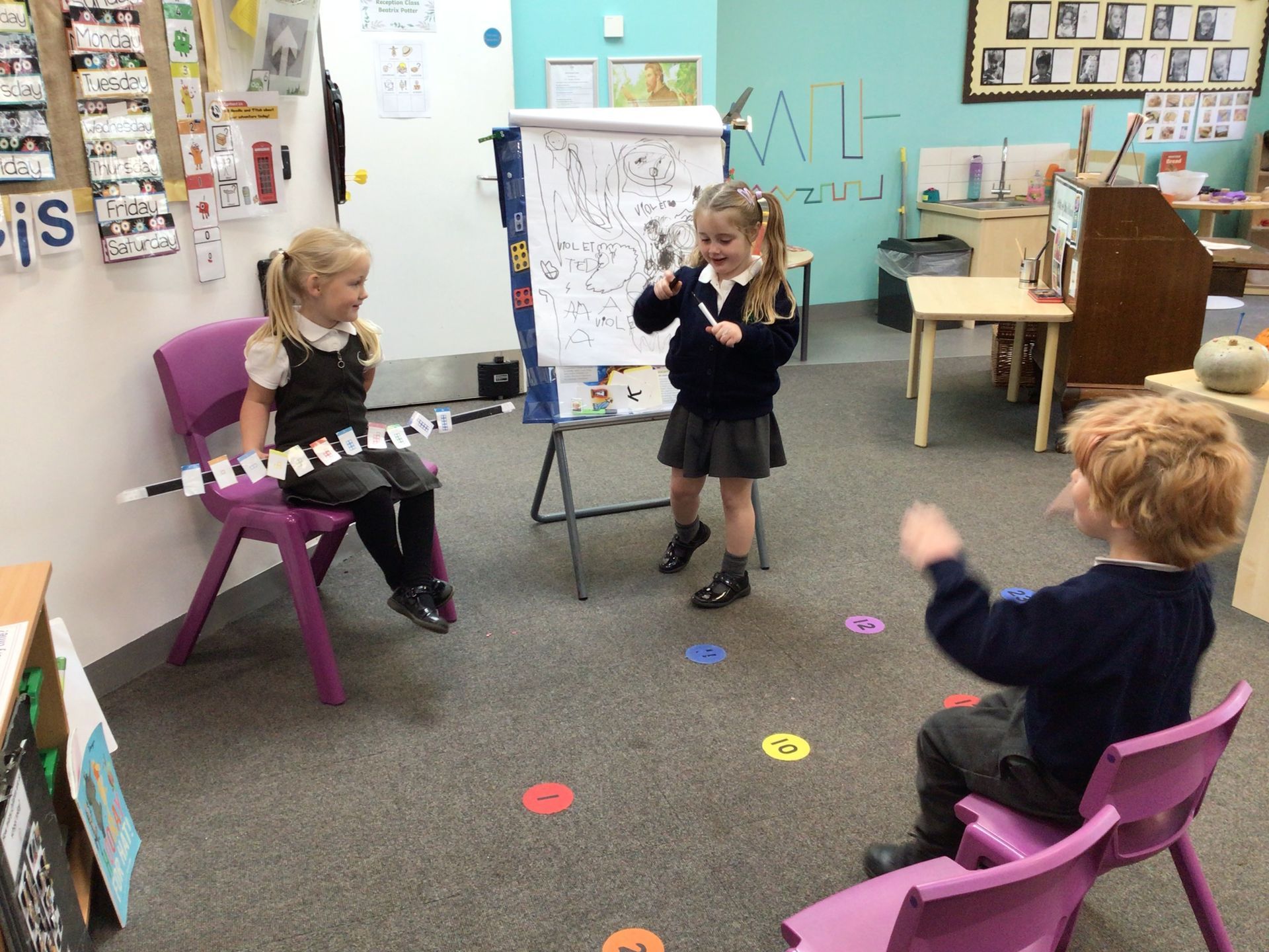 During 'Adventure Time' (play), the children have taken a particular interest in role playing teacher! We have had a calendar, number and phonics teacher!